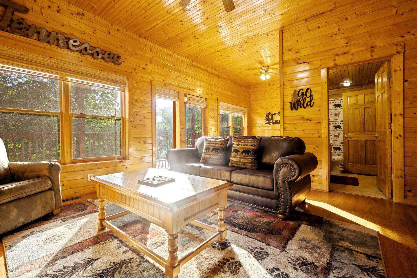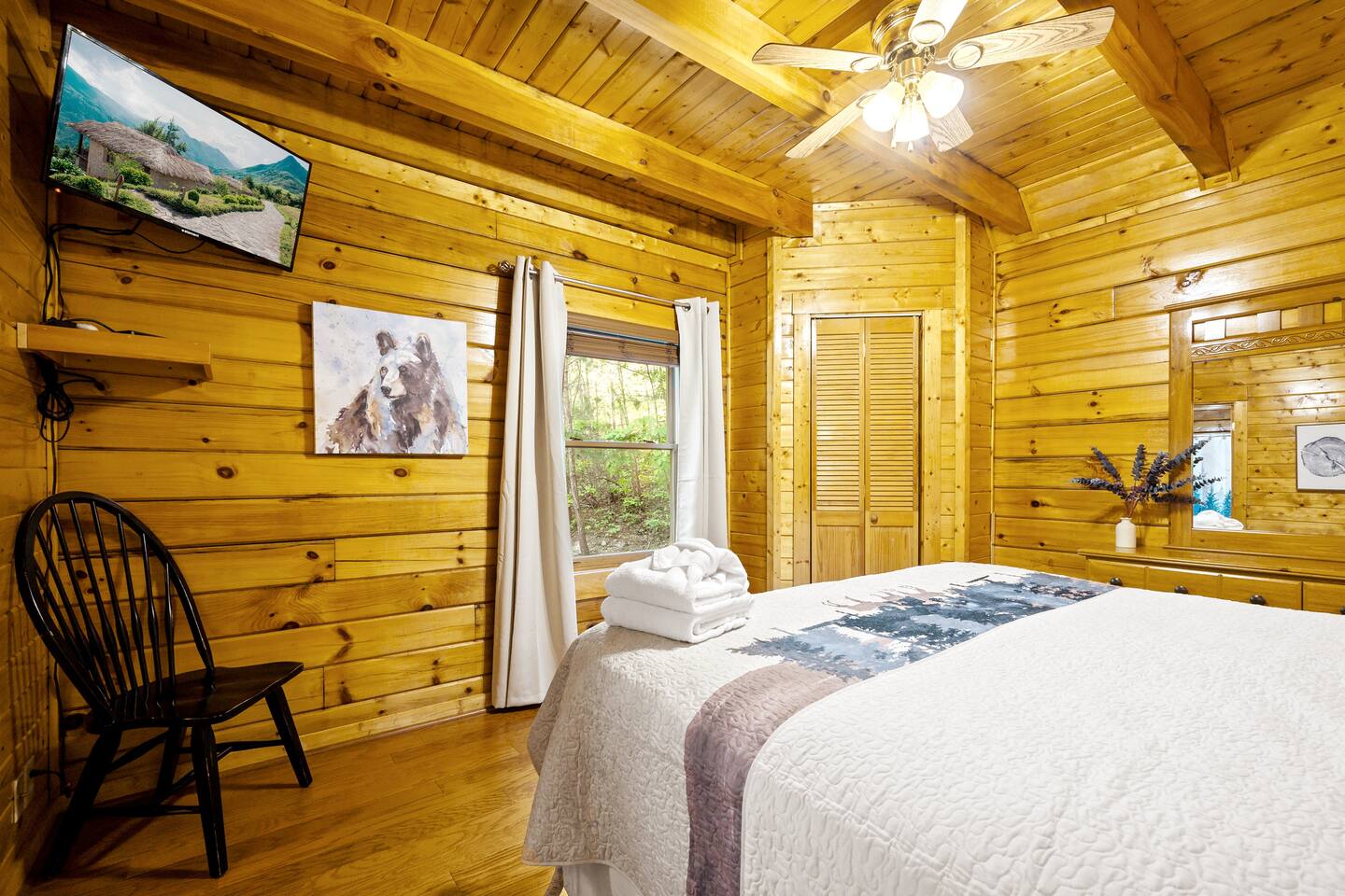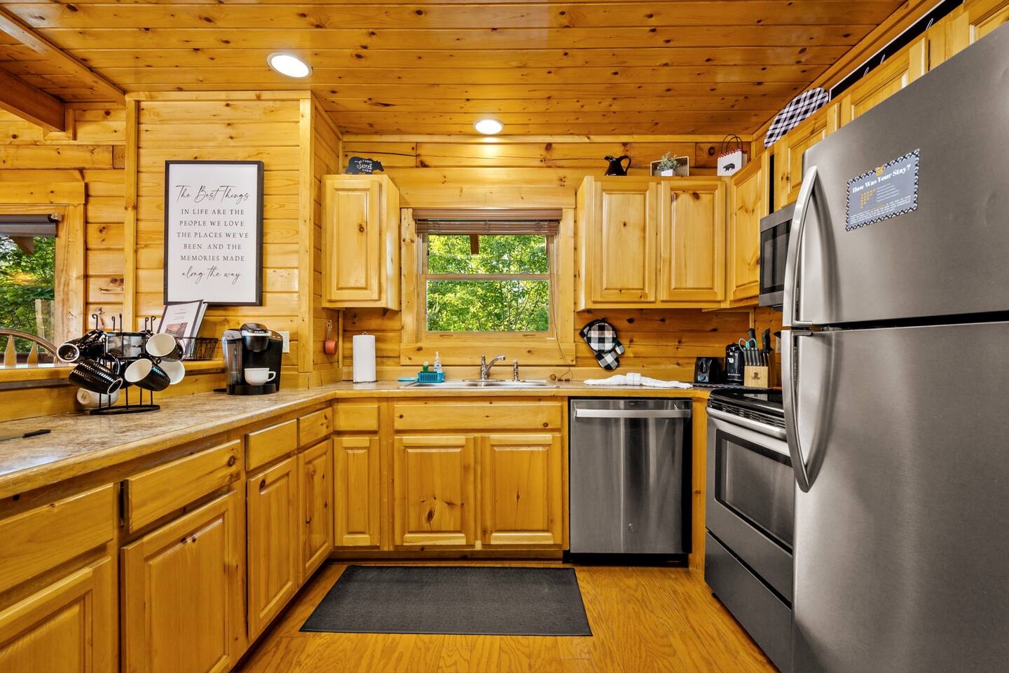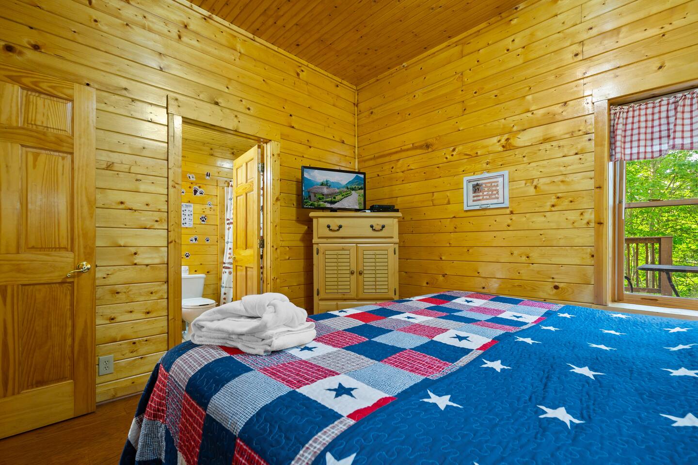 • A starter supply of essentials is provided, including paper towels, dish soap, laundry tabs, trash bags, and basic soaps. Guests may need to purchase additional supplies for longer stays. • All linens, and bath towels are provided for your use. • Each bathroom is equipped with a hair dryer. An iron and ironing board are also available. • High-speed Spectrum Wi-Fi is available throughout the cabin. • For your security, an exterior camera is located on the property, facing the driveway, and the side door. There are no cameras inside the cabin. • It is common to see wildlife such as bears, raccoons, and other animals. Please do not leave food out and secure all trash in the provided animal-proof containers. • Access to the main level of the cabin requires climbing four steps from the driveway. • Guests must provide a valid photo ID for verification prior to check-in. • By booking, you acknowledge that the owners are not responsible for any accidents, injuries, or loss of personal belongings and you assume all risks associated with the use of the property and its amenities.