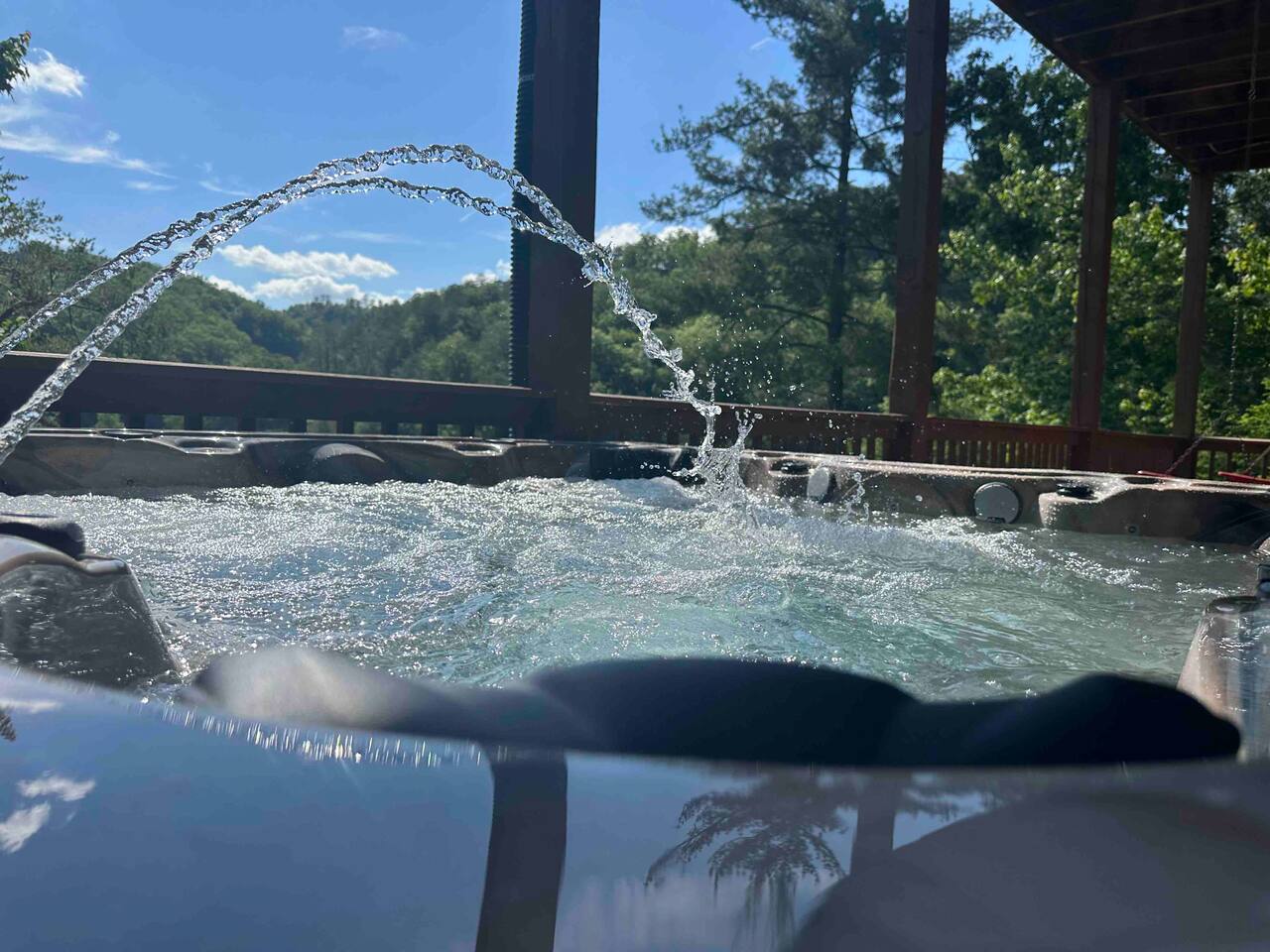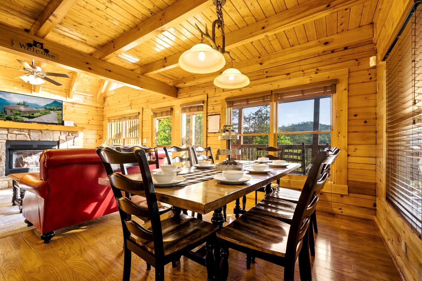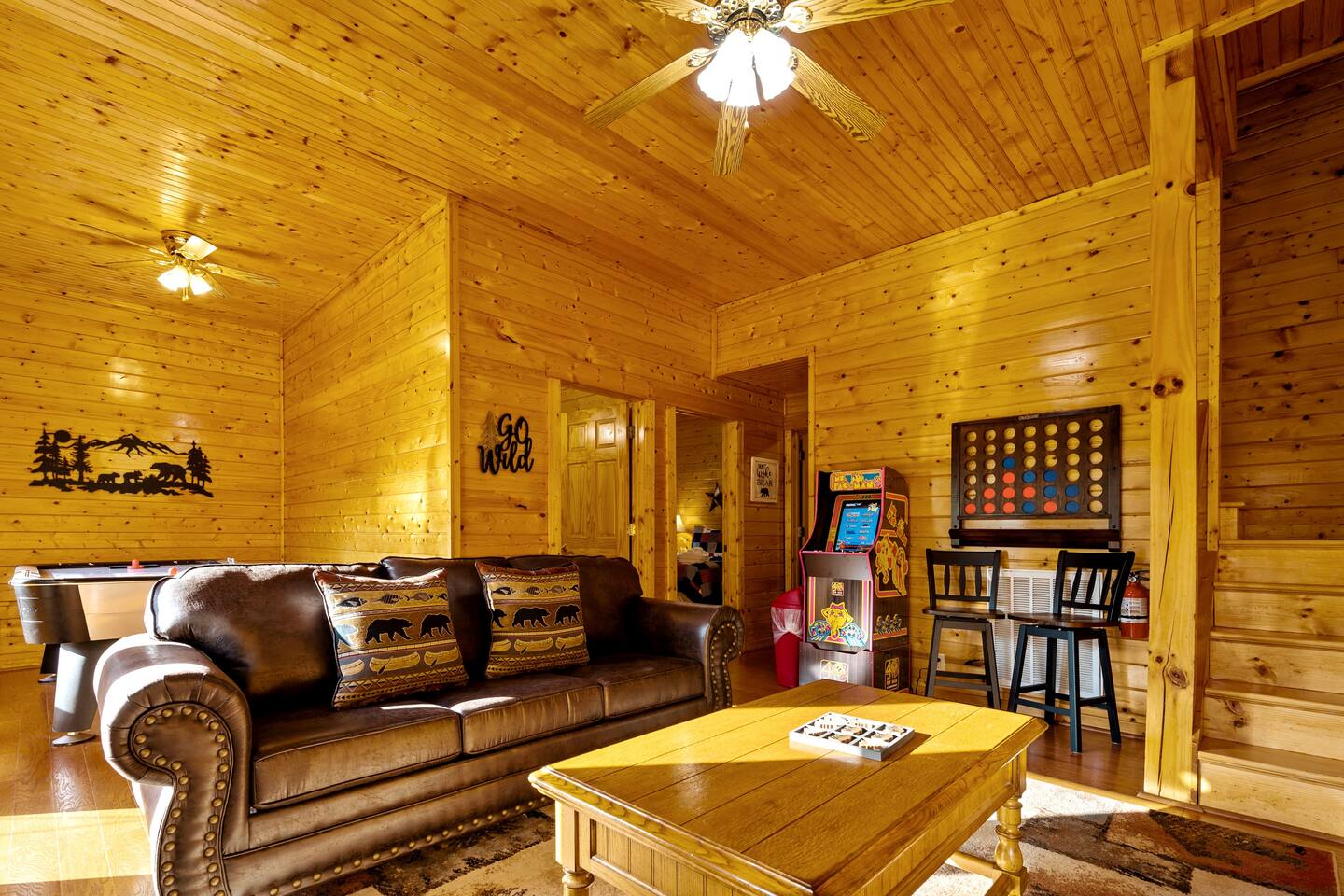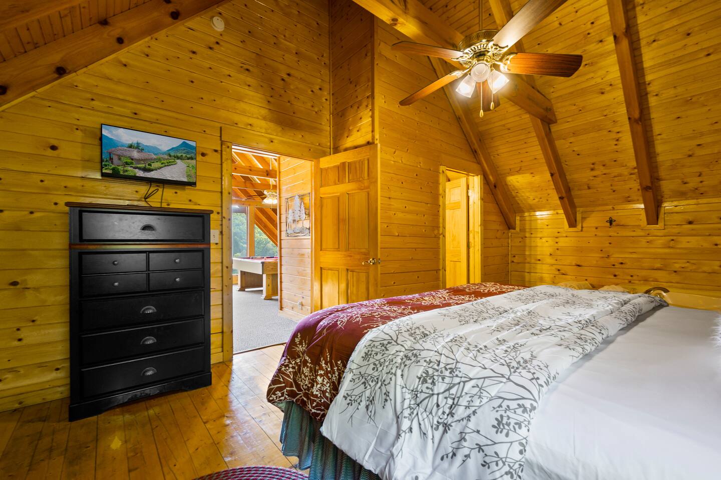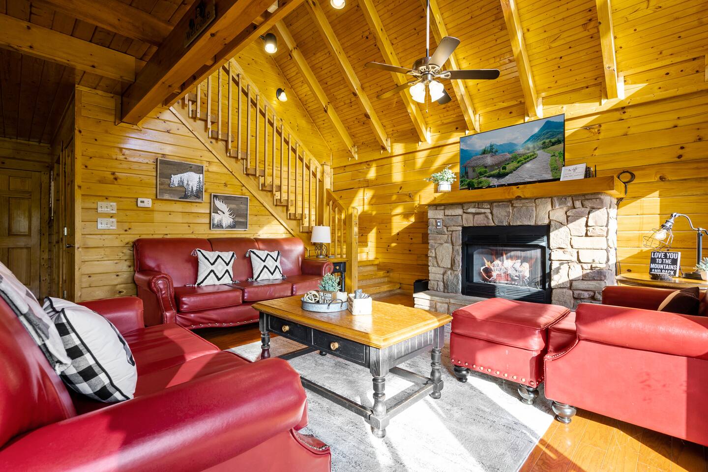 Our multi-level log cabin is designed for comfort, fun, and making memories, comfortably accommodating up to 10 guests. With four king bedrooms, each featuring its own en-suite bathroom and Jacuzzi tub, your group will have plenty of private space to unwind. Main Level: • Spacious living room with a cozy gas log stone fireplace (operational October-March) and a 55-inch smart TV. • Fully stocked kitchen ready for your culinary adventures, equipped with a microwave, Keurig and drip coffee makers, dishwasher, and cookware for 10 guests. • Large 8-person dining table and kitchen counter with seating for two. • One king bedroom and a full bathroom. Upper Level: • Spacious master suite with exposed beams, a jetted tub, an electric fireplace, a Roku TV, and a private bathroom. • Adjoining loft with a pool table and a ping pong tabletop, set against a beautiful mountain view. Lower Level • The Entertainment Hub: • Second living area and game room with a TV and a queen sleeper sofa. • Games galore: air hockey table, a multi-game arcade machine, and a giant Connect Four. • Two large king bedrooms, each with its own private bathroom and jetted tub. • Laundry area with washer and dryer for your convenience. Outdoor Living: • Two levels of wrap-around decks with rocking chairs to soak in the scenery. • Blackstone gas griddle and a picnic table for outdoor dining. • Fire pit for evening gatherings (guests must provide their own firewood). • Private 6+ person hot tub, complete with lights and a Bluetooth speaker.