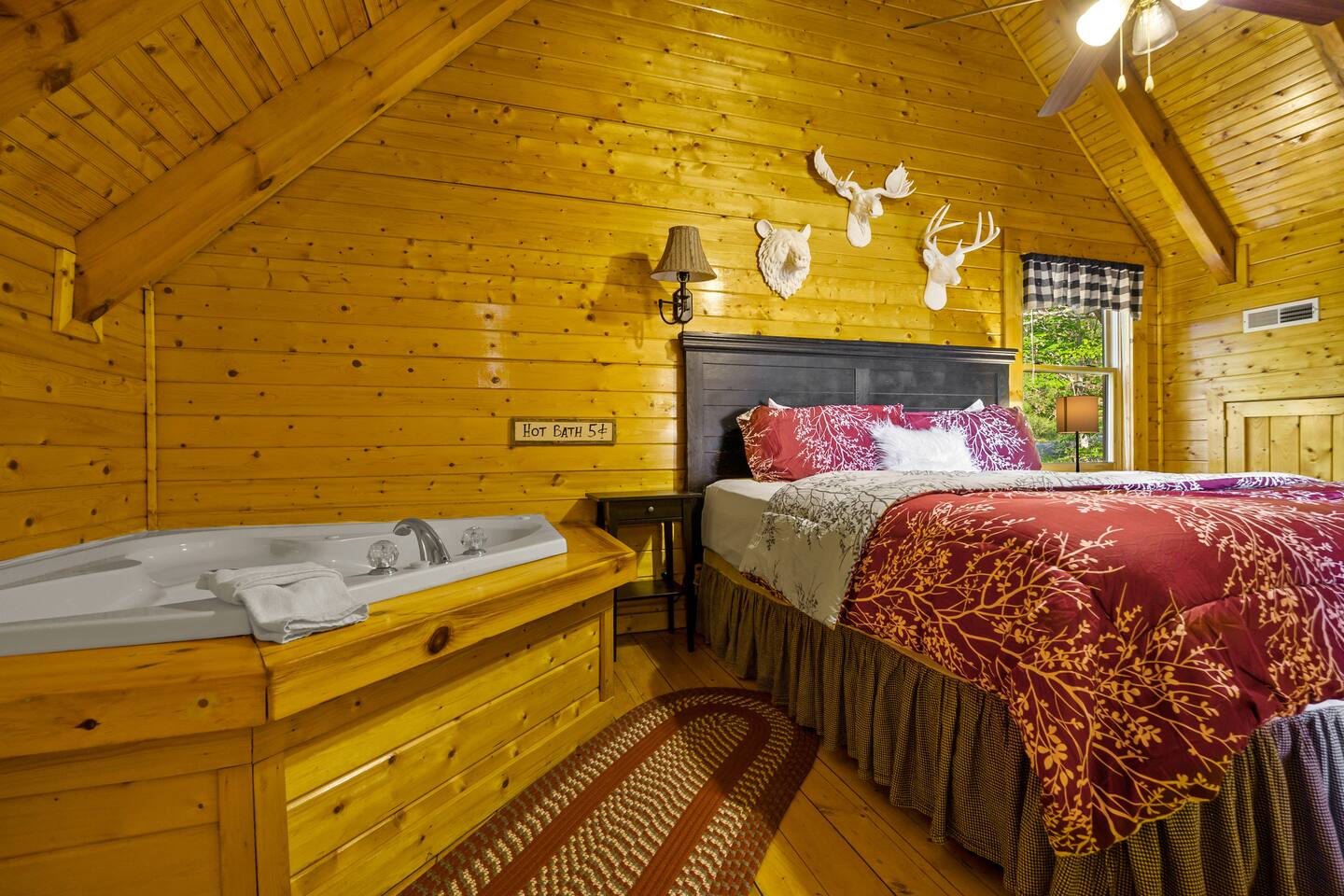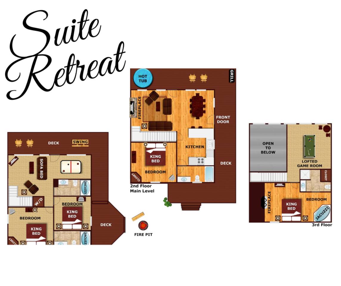 Suite Retreat is located close to all the attractions in Pigeon Forge and Gatlinburg. With 4 King bedrooms, it’s an excellent choice for couples, multi-generational families, and 2 familes travelling together. The cabin features a variety of amenities to keep everyone entertained. Nestled on a 1-acre wooded lot, it ensures privacy with minimal visibility and noise from neighbors.